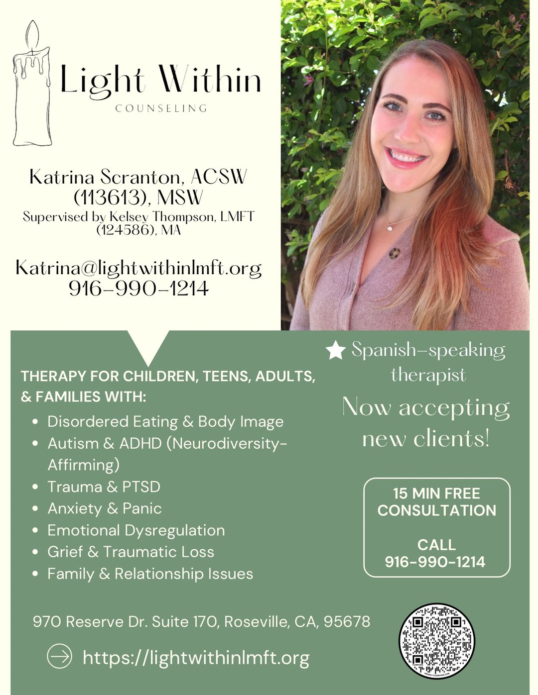 At Light Within Counseling in Roseville, CA, our therapists specialize in treating anxiety disorders, OCD, trauma, depression, substance abuse, grief, & relationship challenges. Our team of therapists are passionate about providing expert care for children, teens, couples and adults. We also offer family therapy and co-parenting therapy. Whether you prefer in-person counseling in Roseville, CA, or the convenience of online therapy for California residents, we’re here to support you every step of the way. Our mission is to help you achieve lasting healing and become the best version of yourself. Contact us today to start your journey towards a brighter future.